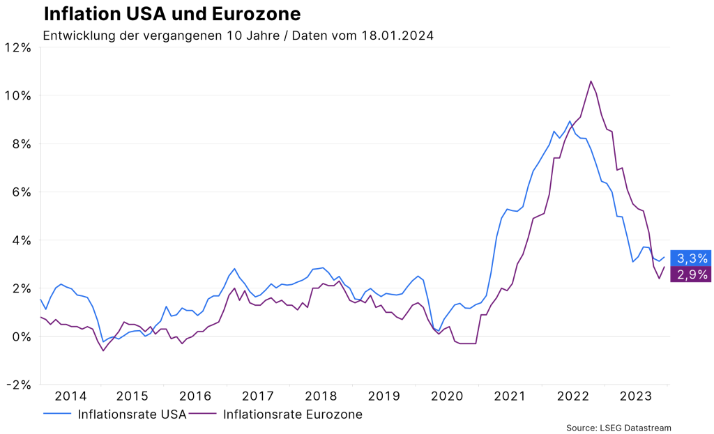 Die Inflationsraten fielen im zweiten Halbjahr 2023 stärker als erwartet. Gleichzeitig lag das Wirtschaftswachstum über den Erwartungen. Diese Entwicklung hat den Optimismus für eine weiteren „schmerzfreien“ Inflationsrückgang in Richtung des Zentralbankziels von 2% bestärkt. Die fallende Inflation wurde jedoch zu einem guten Teil von fallenden Güterpreisen bestimmt, während die Inflation im Dienstleistungssektor nur zögerlich fiel und auf einem zu hohen Niveau bleibt.