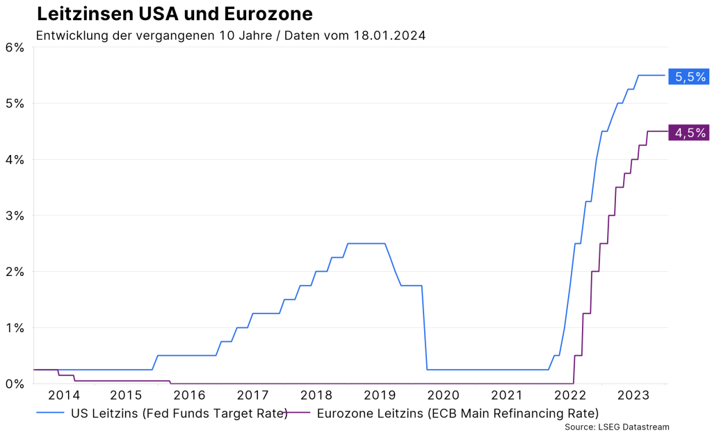 Die wichtigste Zentralbank, die Fed in den USA, hat im Dezember sogar Leitzinssenkungen für dieses Jahr angedeutet. Der Markt hat darauf reagiert und rechnet bereits mit ersten Zinssenkungen im März. Im Basisszenario fällt allerdings die Inflation nicht weiter schnell in Richtung Zentralbankziel. Außerdem bleiben die Inflationsrisiken nach oben gerichtet. Die Zentralbanken werden die Leitzinsen daher nicht so früh senken, wie im Markt eingepreist ist. Erste vorsichtige Senkungen könnten um die Jahresmitte erfolgen. Sollten sich die Wachstumsindikatoren abschwächen sind auch insgesamt deutliche Zinssenkungen bis Jahresende 2024 vorstellbar.