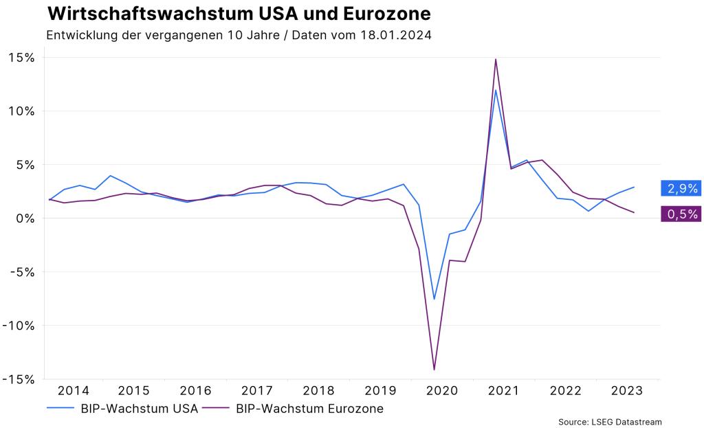 Unter der Annahme, dass die Inflation im ersten Halbjahr auf einem zu hohen Niveau bleibt, wird die Fed nicht so früh senken. Eine länger als eingepreiste restriktive Zinspolitik würde zunehmend auf das Wirtschaftswachstum drücken. Wachstumswerte, die unter dem langfristigen Trend liegen, sind realistisch. Im Basisszenario wird damit das Wachstum in den USA eher in Richtung der niedrigeren Niveaus in Europa konvergieren als umgekehrt.