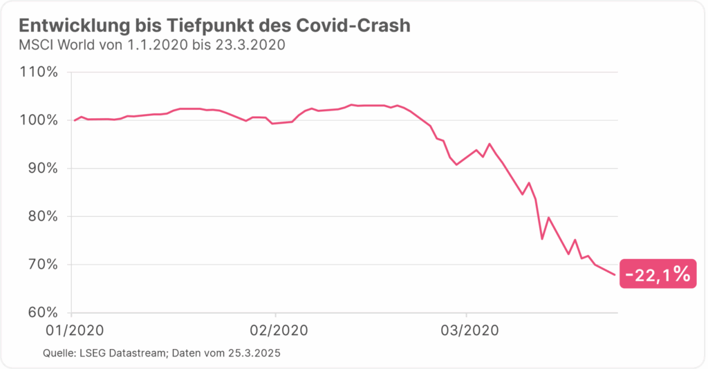 Die Corona-Pandemie hielt die Welt und die Märkte im Jahr 2020 in Atem. Auch die folgenden Jahre waren geprägt von Lockdowns, Unsicherheit und dem Rennen um einen Impfstoff gegen Covid-19. Während der Corona-Crash an den Börsen als der schnellste Crash aller Zeiten in die Geschichte einging, verlief auch die darauffolgende Erholung bemerkenswert rasch. Anleger:innen die einen kühlen Kopf bewahrten und investiert blieben, konnten an diesem Comeback der Börsenkurse nach dem Crash teilhaben.