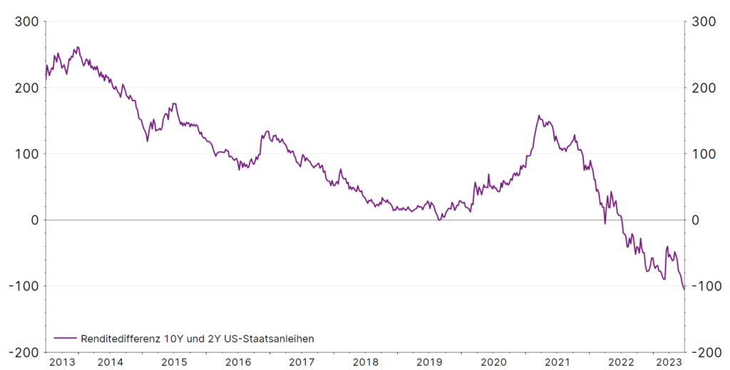 Die Differenz zwischen der Rendite von 2- und 10-jährigen US-Staatsanleihen war im letzten Jahr negativ. In der Vergangenheit deutete dies in der Regel auf eine bevorstehende Rezession hin. Quelle: Refinitiv Datastream, Entwicklung der vergangenen 10 Jahre. Hinweis: Die Entwicklung in der Vergangenheit ist kein zuverlässiger Indikator für künftige Wertentwicklungen.