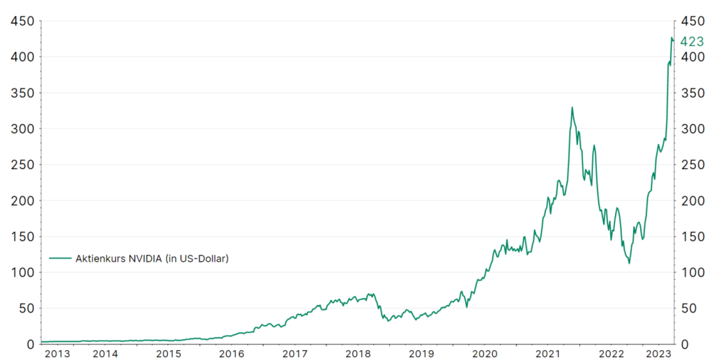 Nvidia-Aktien stiegen dank des Engagements des Unternehmens im Bereich der künstlichen Intelligenz an. Quelle: Refinitiv Datastream, Entwicklung der vergangenen 10 Jahre. Hinweis: Die Entwicklung in der Vergangenheit ist kein zuverlässiger Indikator für künftige Wertentwicklungen.