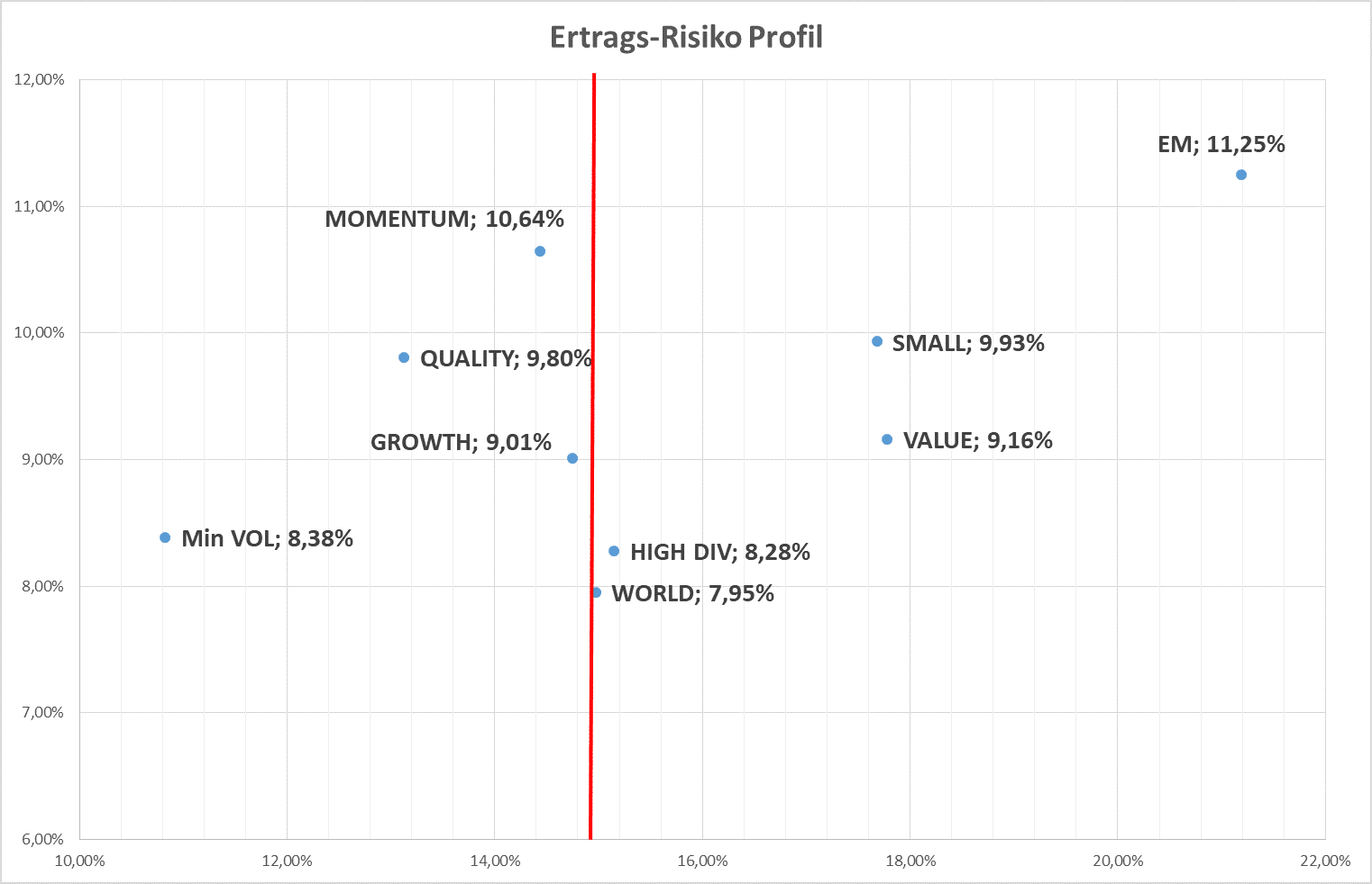 Bezogen auf die bekanntesten Faktoren, betrachten wir in Graphik 1 das Risiko (x-Achse)/ Ertragsprofil (y-Achse) unter Berücksichtigung der letzten 20 Jahre: