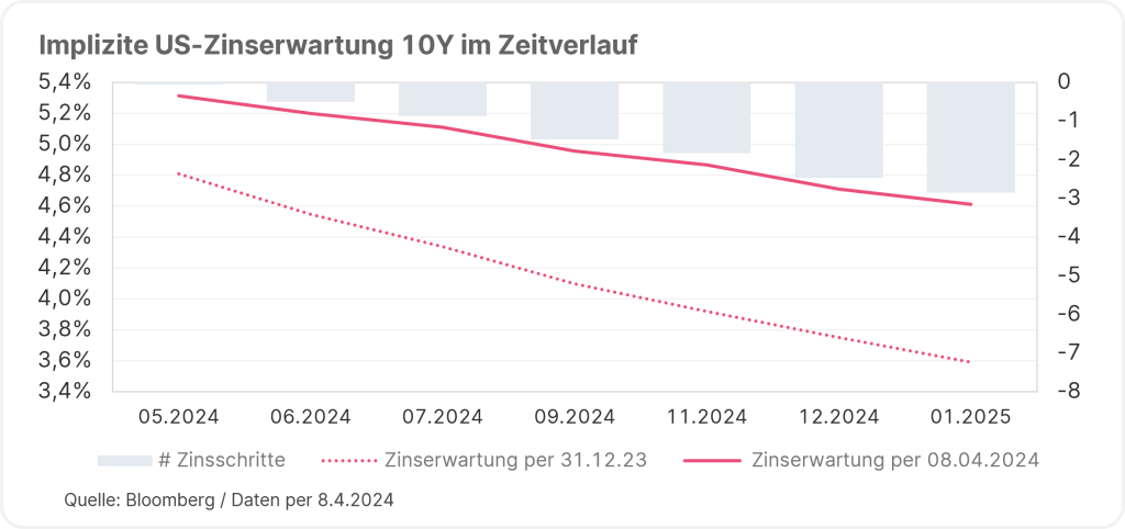 Der US-Notenbankpräsident Jerome Powell, dessen Mandat im Wesentlichen die Preisstabilität und größtmögliche Beschäftigung in den USA umfasst, muss sich wohl noch weiter in Geduld üben. Die Weichen stehen weiterhin auf Zinswende, allerdings haben die Zinsmärkte in den letzten Monaten bereits reagiert. Während zum Jahreswechsel noch 7 Zinssenkungen im Jahresverlauf erwartet wurden, werden gegenwärtig – wie unten dargestellt – nur mehr zwei bis drei Zinsschritte gepreist.