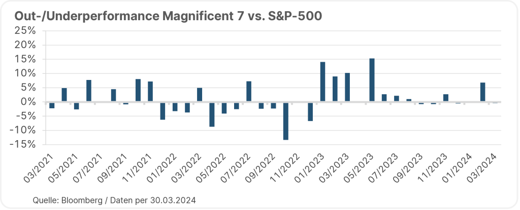 Die unten angeführte Darstellung zeigt beispielsweise die monatliche Performanceunterschiede der Magnificent 7 (Apple, Amazon, Alphabet, Meta, Microsoft, Nvidia, Tesla) im Vergleich zum breiten Aktienindex S&P-500. Wie unschwer erkennbar ist, entwickeln sich die technologielastigen Indexschwergewichte weiterhin solide, jedoch scheint die massive Outperformance vorerst passé zu sein. Zum Teil hat sich diese sogar umgekehrt – so verlor Tesla seit dem Jahreswechsel beispielsweise mehr als 30% oder aber auch Apple hat mit mehr als -10% ein deutliches Minus zu Buche stehen. Die wiedererlangte Marktbreite ist auch dahingehend positiv zu werten, da die Kurse nun die gesamthaft solide wirtschaftliche Situation widerspiegeln.