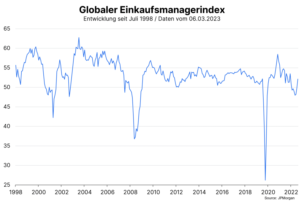 Die Hinweise für eine Zunahme, also einer Beschleunigung, des globalen realen Wirtschaftswachstums haben in den vergangenen Tagen zugenommen. Mit dem globalen Einkaufsmanagerindex ist einer der wichtigsten umfragebasierten Wirtschaftsberichte veröffentlicht worden. Die Gesamtzahl zeigte für den Monat Februar einen Anstieg und das schon zum dritten Mal in Folge. Dabei hat sich der Anstieg sogar beschleunigt.