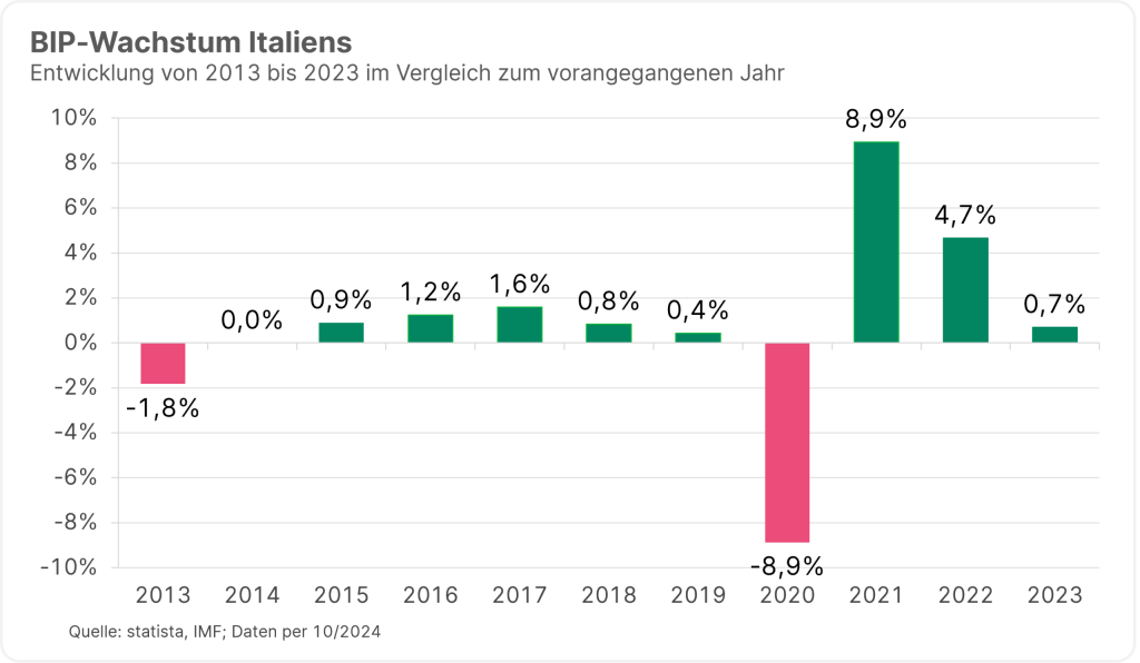 Obwohl das BIP-Niveau von 2008 erst letztes Jahr wieder erreicht wurde, ist das Wirtschaftswachstum im Vergleich zu Ländern wie den USA, Frankreich, Deutschland und dem Vereinigten Königreich gering. Gründe dafür sind eine stagnierende Produktivität, mangelnde Investitionen und Innovationen sowie eine restriktive Politik. Zudem hat Italien eine alternde Bevölkerung und eine niedrige Geburtenrate, was das Wachstum weiter hemmt.