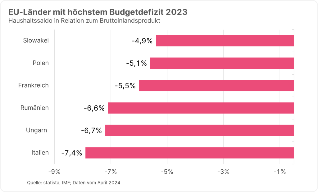 Problematisch bleibt dennoch die Budgetdisziplin der öffentlichen Hand. Die Europäische Kommission erwartet, dass Italiens Haushaltsdefizit 2024 etwa 5 % des BIP ausmacht. Dies ist zusammen mit Frankreich der drittschlechteste Wert in der EU nach Rumänien und der Slowakei. Zieht man das Jahr 2023 zum Vergleich heran, markierte Italien schon damals das Schlusslicht in Sachen Haushaltsdefizit in der EU.