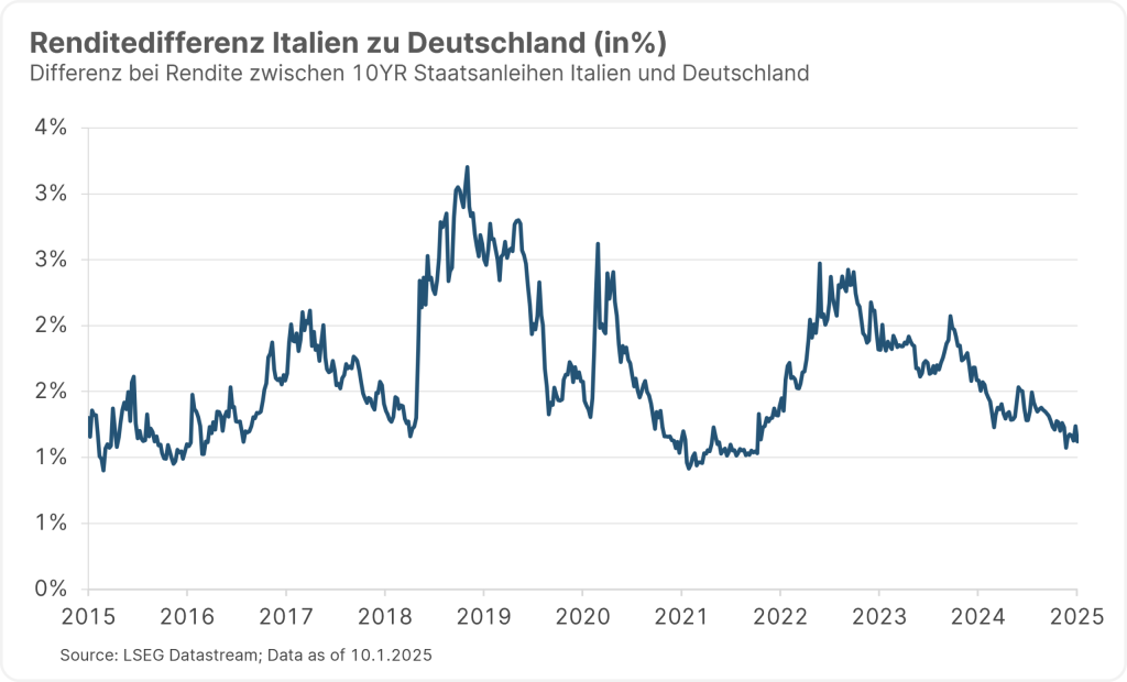 Unabhängig davon sind aber auch hohe Investitionen in die Infrastruktur getätigt worden. Der italienische Staat plant beispielsweise bis zum Jahr 2030 ihr Stromnetz um rund 70 Gigawatt an Anlagen zur Energiegewinnung aus erneuerbaren Quellen zu erweitern. In das dortige Schienennetz sollen ebenso bis zu 60 Milliarden Euro fließen. Viele Projekte laufen auch in der Wasser- und Abfallwirtschaft. Italien erhält hierfür noch bis 2027 hohe Fördergelder aus der Aufbau- und Resilienzfazilität der Europäischen Union.
