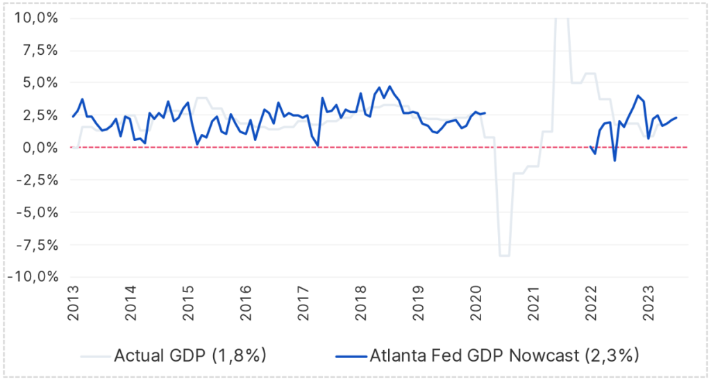 Eine Rezession bedeutet im Grunde eine kontrahierende Wirtschaft für ein halbes Jahr. Bis belastbare Werte für das Wirtschaftswachstum eintreffen, vergehen jedoch mehrere Monate, und selbst dann kann es im Nachhinein noch zu Revisionen kommen. Diesen Aspekt versucht das „Nowcasting“ zu entschärfen, das dem Wirtschaftswachstum zeitnahe frisch einlangende Daten zugrunde legt. Der folgende Chart bietet zwei Erklärungen: 1. Die Aussagekraft der „Nowcast“-Werte (blaue Linie) für das tatsächliche Wirtschaftswachstum (graue Linie) ist zufriedenstellend, und 2. der aktuelle Wert liegt bei +2,3% und damit lange nicht im Rezessions-Bereich.