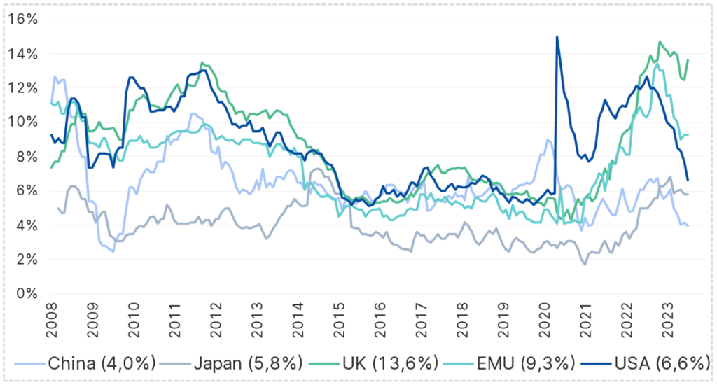 Eine Maßzahl für die Belastungen, denen sich die Bevölkerung ausgesetzt sieht, ist der sogenannte „Misery“-Index, der Inflation (in %) und Arbeitslosigkeit (in %) addiert. Hier zeigt der folgende Chart, dass unsere Welt auch nach der Pandemie noch mehr als genug „Misere“ ausgesetzt war. Die unter diesen Umständen erfreuliche Nachricht ist, dass die Belastungen jetzt nachlassen, und die Inflation zurückgeht. Die Arbeitslosenrate hat interessanterweise in diesem Zeitraum kaum zur Belastung beigetragen, da international ein Arbeitskräftemangel vorherrscht. Das höchste „Misery“-Ausmaß trägt derzeit noch Großbritannien.