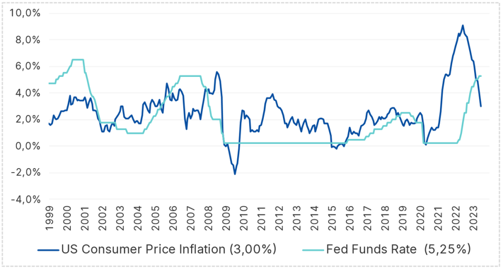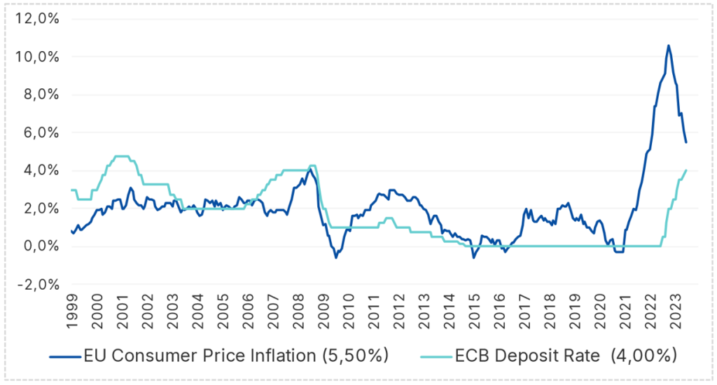 Ein interessanter Aspekt ist, dass die Inflation im Euroraum in den letzten 10 Jahren überwiegend unter dem angestrebten Wert von 2% gelegen hat. Die Entscheidung der EZB, vergleichsweise spät in den Zinserhöhungszyklus einzusteigen, wird kontroversiell diskutiert – sie ist auch vor diesem Hintergrund zu sehen.