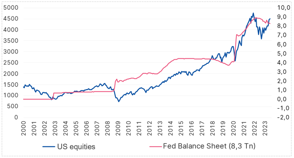 Seit Jahresmitte 2022 verringert sich die Bilanzsumme der US-Fed, d.h. die Geldmenge, die zur Unterstützung in die Wirtschaft geschleust wurde. Zugleich hat sich die rote Linie im Chart erst wenig von ihren Höchstständen entfernt. Die gute Nachricht ist hier, dass sich die Aktienkurse von der Unterstützung durch die Notenbank „emanzipiert“ haben könnten, und so auf die fortbestehende Reduktion der Liquidität nicht zwangsläufig mit Verlusten reagieren werden müssen.