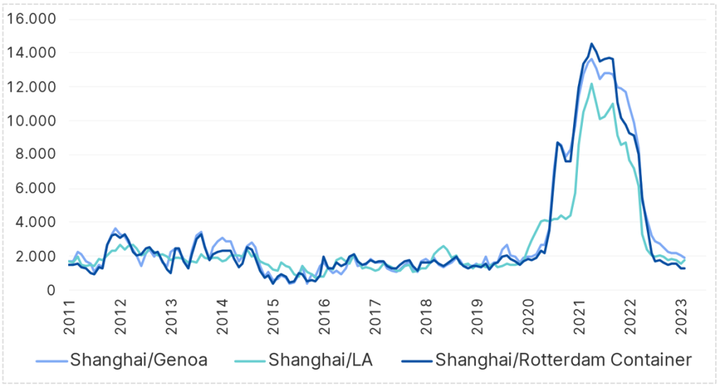 In der Pandemie wurde eine massive Verstopfung der globalen Lieferketten festgestellt. Mit eine Ursache war, das sich die Internet-Bestellungen stark erhöht haben, für Waren, die einen langen Lieferweg erfordern. Der Preis, den es für den Transport eines Containers auf einem Frachtschiff zu bezahlen galt, war explodiert: