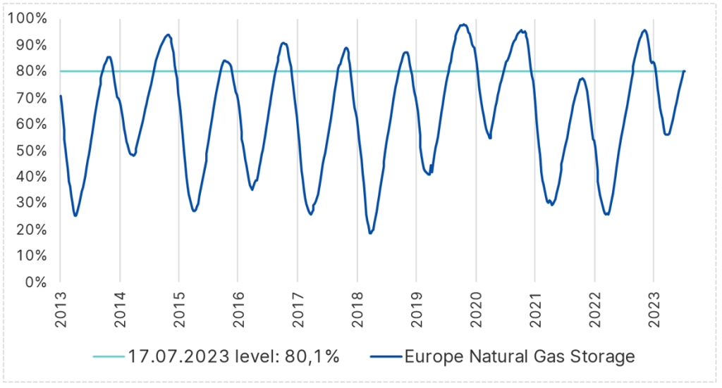 Der milde Winter hat die Situation zusätzlich viel einfacher gemacht. Stand heute liegt der Füllstand EU-weit bereits wieder bei 80,1% und damit höher als in vielen Sommern davor. Das sollte Europa einen „Startvorteil“ für den Winter 2023/24 verschaffen: