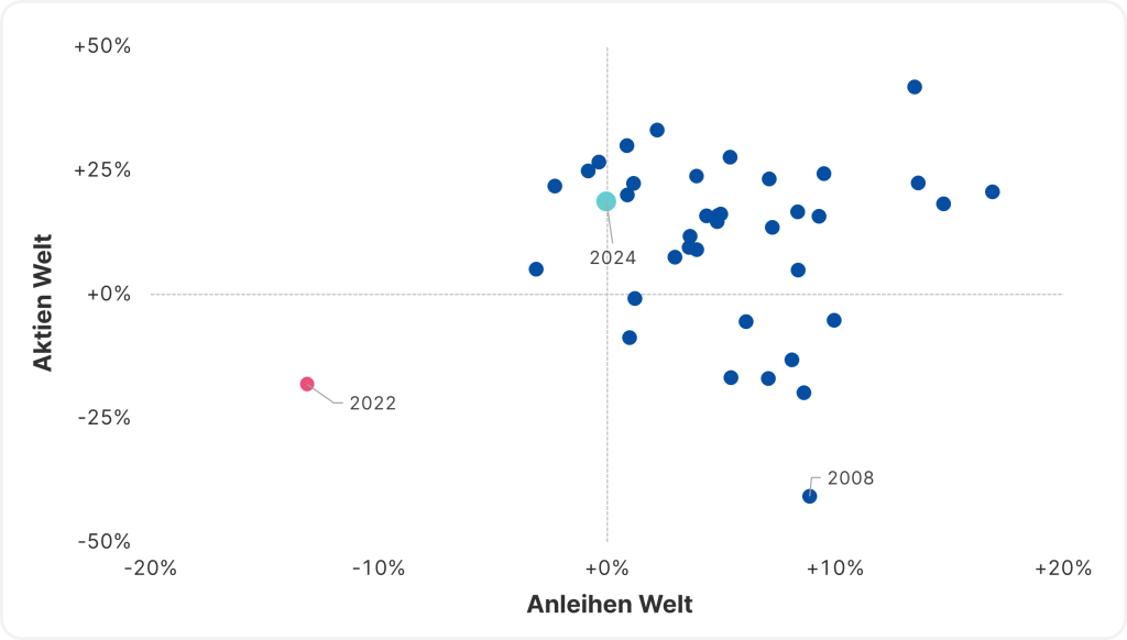 In der Rückschau fühlt sich 2024 für uns Assetmanager kompliziert an – gerade für Aktieninvestments gab es wiederholt gute Gründe, vorsichtig zu sein: In den Monaten Juli-September haben sich die volkswirtschaftlichen Daten der USA deutlich eingetrübt, und grundsätzlich verlässliche Indikatoren schienen auf eine Rezession hinzuweisen. Blickt man jedoch allein auf das Jahresergebnis, handelt es sich um ein weiteres Jahr der Normalität, wie es der folgende Chart zeigt. 2024 liegt unauffällig innerhalb der „Punktwolke“ historischer Jahreserträge für Aktien und Anleihen, aus der eigentlich nur die Jahre 2022 und 2008 herausfallen.