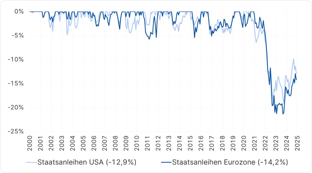 Auch Staatsanleihen-Investments können gut für 2025 mitgenommen werden – darauf deutet unser abschließender Chart hin. Die Verluste, die 2022 auftraten, sind noch nicht aufgeholt. Weiters besteht für die Notenbanken durch sinkende Leitzinsen die Möglichkeit, Anleiheninvestoren „unter die Arme zu greifen“.