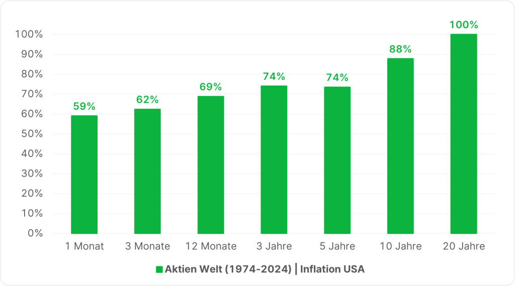 Was bleibt, ist die „Superkraft“ von Aktien, die Inflation zu bekämpfen. Der nächste Chart vergleicht den Ertrag eines globalen Aktienkorbs mit der Inflation, und das in unterschiedlichen Zeitfenstern, zwischen einem Monat und 20 Jahren. Ein ganz kurzes Aktieninvestment lag in ca. 59% der Fälle besser als die Inflation – hingegen konnte man als Kunde mit einem 20-jährigen Veranlagungshorizont in 100% der Fälle die Inflation kompensieren. Zugrunde liegt der Zeitraum 1974-2024. Zu beachten ist, dass ein Investment in Aktien immer auch Risiken mit sich bringt.