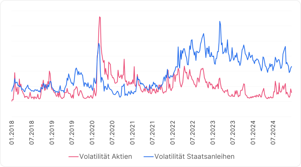 Eher zu weichen scheint die Volatilität von Aktien und Staatsanleihen, also die kurzfristige Schwankungsbreite, die Anleger:innen tendenziell Sorgen bereitet. Wie es der folgende Chart zeigt, ist die Volatilität von Aktien 2024 nur kurz aufgeflackert, und das in überschaubarem Ausmaß. Die Volatilität von Anleihen andererseits dürfte ihren Höhepunkt 2023 dauerhaft hinter sich gelassen haben, als die Inflation die Anleihenmärkte durcheinandergewirbelt hatte. Trotzdem darf man die Volatilität nie ganz abhaken, da sie letztlich eben der Ausdruck von plötzlichen und unerwarteten Ereignissen ist.