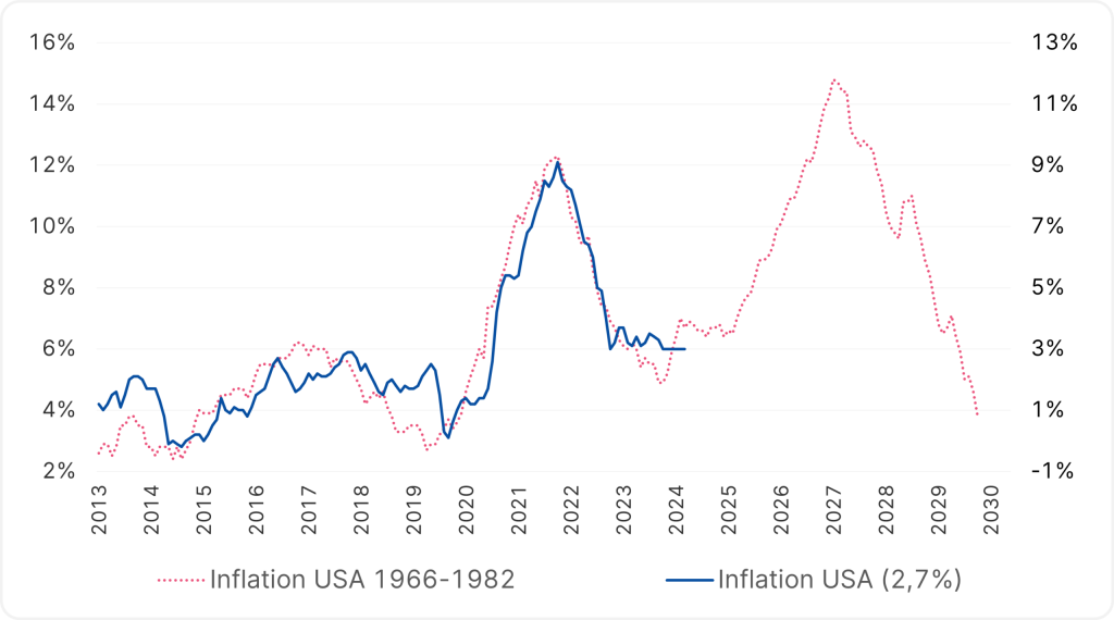 Ob das Inflationsgespenst endgültig gebannt ist? Dafür spricht vieles, trotzdem wird es erst die Zeit zeigen. Man kann hier einen Vergleich mit den 1970er-Jahren ziehen – der nächste Chart legt die Inflation damals und heute übereinander. Damals kam die Ölpreisschock-Inflation vorderhand unter Kontrolle, nur um später eine 2. Welle zu zeigen. Strenggenommen gibt es heute keine triftigen Gründe, die ein Comeback der Inflation anzeigen – potenzielle Ursachen könnten explodierende Rohstoffpreise durch geopolitische Konflikte sein, wie es der Angriff auf die Ukraine bereits einmal gezeigt hat.
