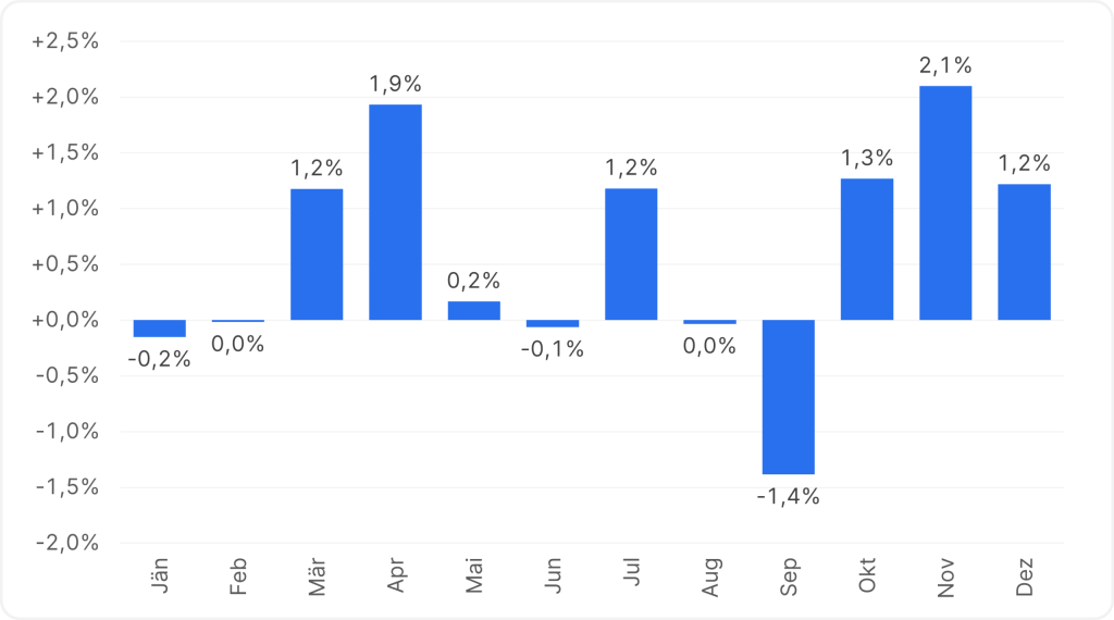 Bestehen bleibt offensichtlich weiterhin der „Kalendereffekt“ für Aktieninvestoren. Naturgemäß ist das eine Durchschnittsbetrachtung, und diese Wirkung tritt nicht jedes Jahr auf, jedoch zeigt sich, dass das 4. Quartal tendenziell lukrativer ausfällt (Betrachtung ab 1999). Das war auch 2024 so.