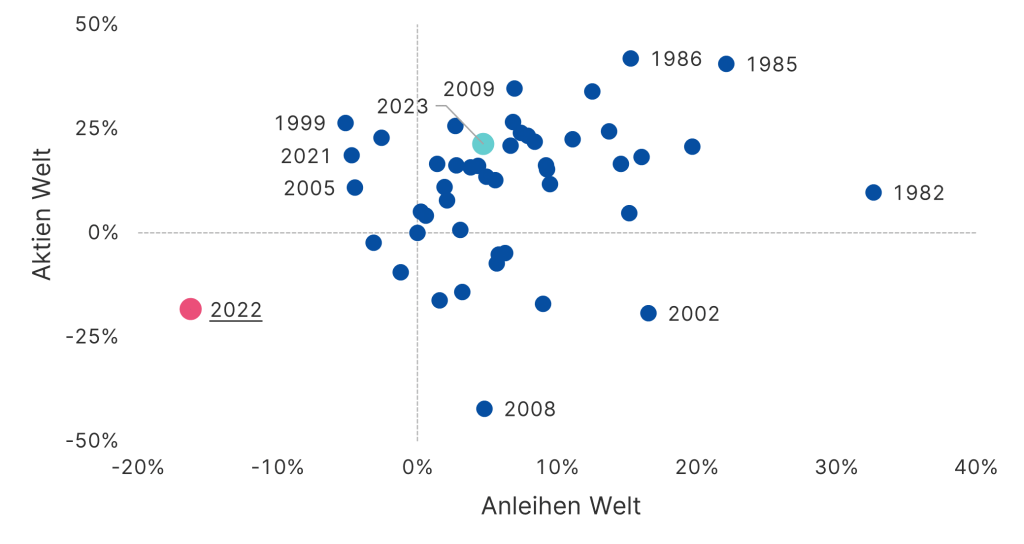 In Summe befindet sich das laufende Jahr sozusagen in der Mitte der Punktwolke aus den Jahreserträgen für Aktien und Anleihen der vergangenen fünf Jahrzehnte: