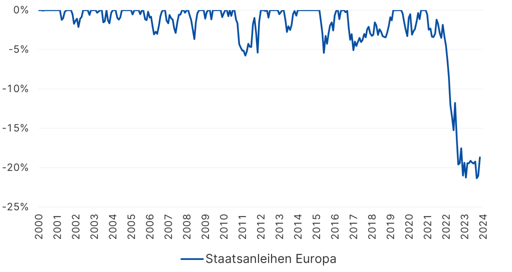Was kommt und bleibt, sollte die wieder erstarkte Ertragsquelle Anleihen sein. Der folgende Chart zeigt die Verlustphasen für europäische Staatsanleihen in der Vergangenheit: