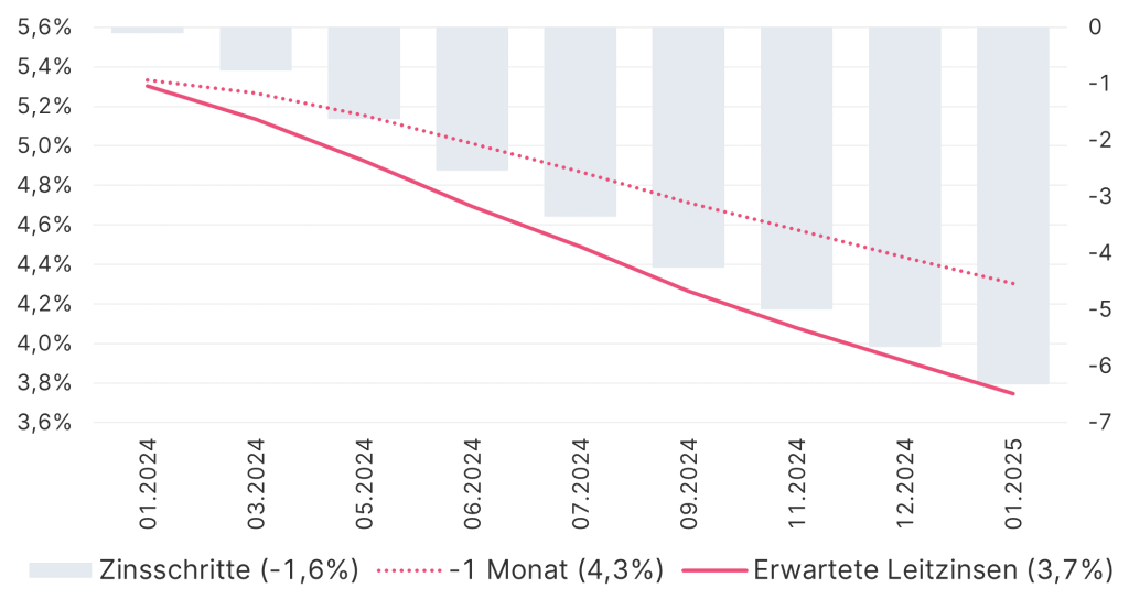 Auf den Finanzmärkten lässt sich die Erwartung der zukünftigen Leitzinsen ablesen. Diese Einschätzung ist wohlgemerkt eine Momentaufnahme und selbst volatil, trotzdem kann sie ein Indikator für 2024 sein. Der folgende Chart zeigt das Bild für die USA: