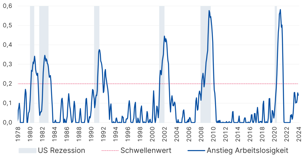 Rezessionen sind, möchte man fast sagen, notorisch schwierig zu prognostizieren bzw. zeitnahe zu erkennen. Wären Rezessionen mit einer guten Vorlaufzeit prognostizierbar, so gäbe es sie überhaupt nicht, weil noch Zeit bliebe, gegenzulenken. Ein Indikator, ein Signal für eine Rezession war in der Vergangenheit ein plötzlicher, kräftiger Anstieg der Arbeitslosigkeit. Das zeigt der folgende Chart: