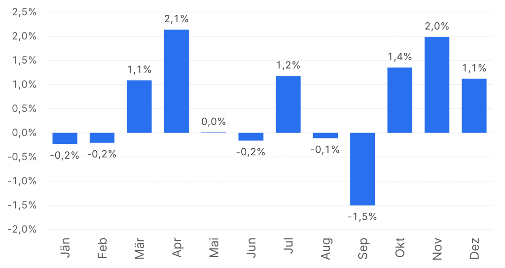 Hier zeigt sich, dass das 4. Quartal ein gutes war („Jahresende-Rallye), und der Sommer schwierig ist („Sell in May…“), besonders der September.