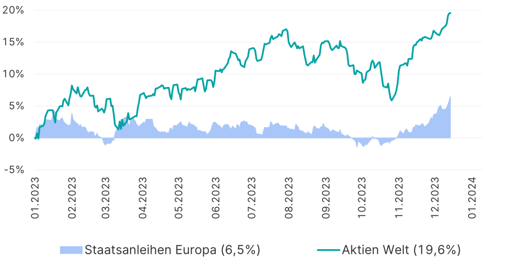 Entwicklung 2023 europäische Staatsanleihen und weltweite Aktien