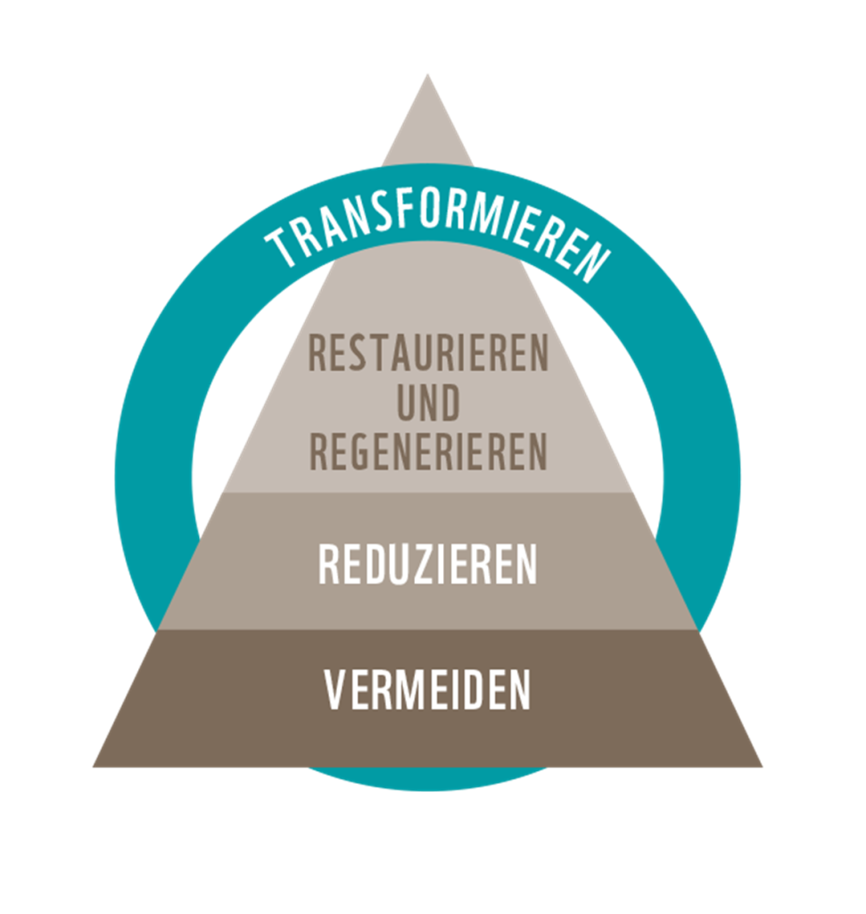 Unternehmen reduzieren durch verschiedenste Maßnahmen ihre Beiträge zum Biodiversitätsverlust. Beispielsweise passen Unternehmen Produktionsprozesse an, optimieren ihr Geschäftsmodell in Richtung Kreislaufwirtschaft und arbeiten eng mit ihren Lieferant:innen entlang der gesamten Wertschöpfungskette zusammen. Maßnahmen werden anhand der Maßnahmenhierarchie (vermeiden, reduzieren, Restaurieren und Regenerieren, Transformieren) umgesetzt.