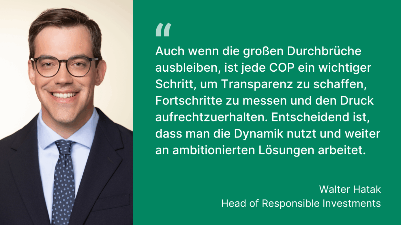 Dass es die globale Zusammenarbeit und den Dialog in Form der Weltklimakonferenz unverändert braucht, steht für den Responsible-Investments-Experten Hatak fest: „Auch wenn die großen Durchbrüche ausbleiben, ist jede COP ein wichtiger Schritt, um Transparenz zu schaffen, Fortschritte zu messen und den Druck aufrechtzuerhalten. Entscheidend ist, dass man die Dynamik nutzt und weiter an ambitionierten Lösungen arbeitet.“