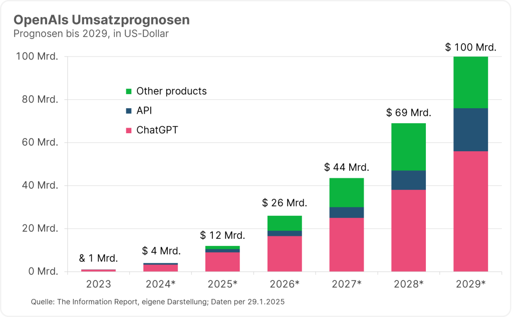 Diese Desillusionierung ist für OpenAI, die Schöpfer von ChatGPT und Wegbereiter des KI-Booms, doppelt schmerzhaft. Einerseits befindet sich das Unternehmen auf dem Weg zum IPO, wo es gerne mehr als 100 Mrd. Dollar an Investorengeldern einsammeln möchte. Hinter diese Absichten muss man nun ein sehr großes Fragezeichen setzen. Andererseits hatte das Unternehmen seine gesamte Wachstumsstrategie auf das B2C-Geschäft gesetzt. Einen Großteil seines Umsatzes von etwa 4 Mrd. US-Dollar im Jahr 2024 kam aus dem Abo-Geschäft. Bis 2029 sollte allein dieser Geschäftszweig auf über 50 Mrd. Dollar anwachsen. Zusätzlich wagte sich OpenAI unlängst in ein neues Preisschema. So sollte das neueste Modell o3 nur mehr Pro-Nutzern zur Verfügung stehen, die bereit sind dafür 200 US-Dollar pro Monat zu zahlen. Damit sollte endlich auch die Rentabilität des Unternehmens stabilisiert werden, das Schätzungen zufolge immer noch für zwei Dollar Umsatz einen Dollar Verlust schreibt.