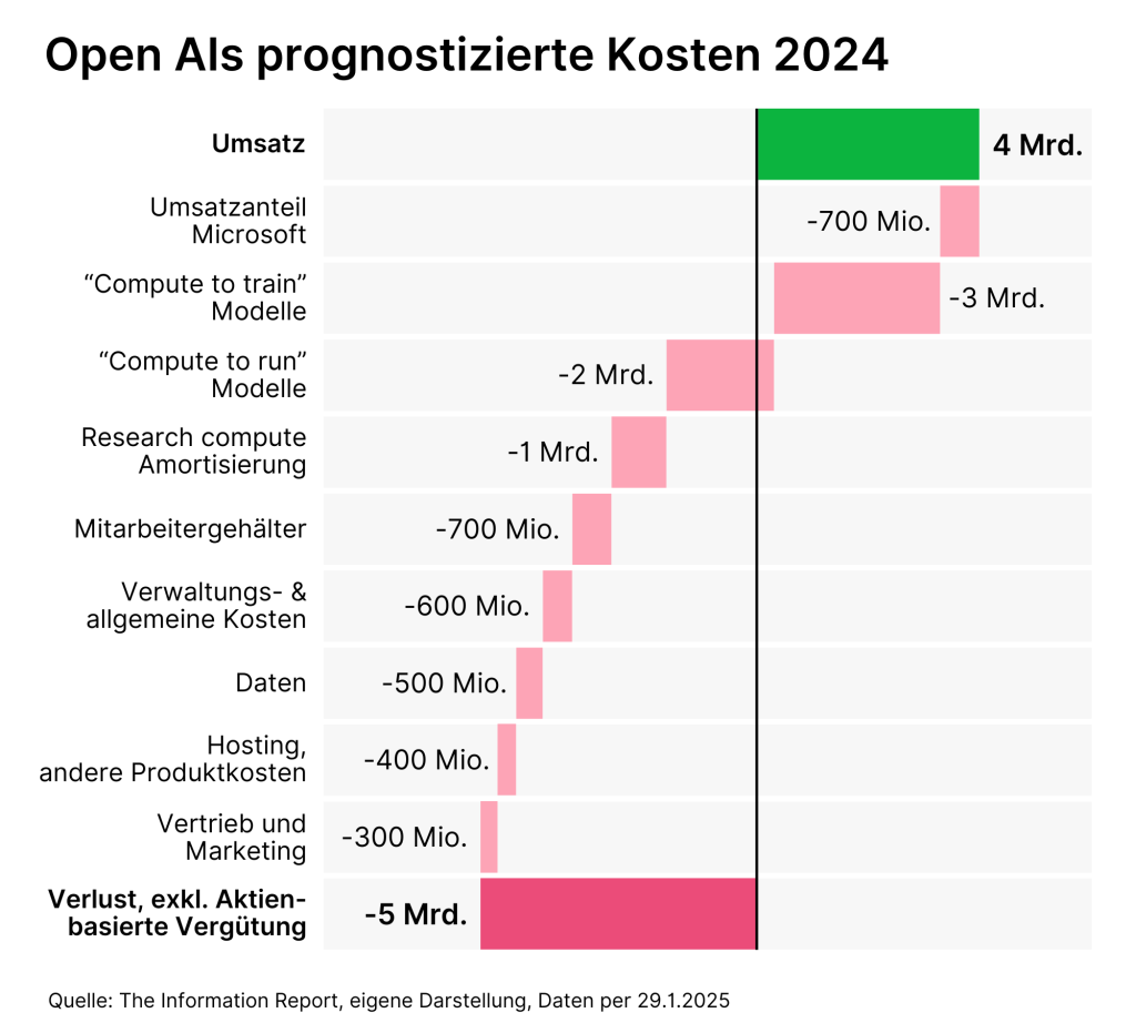 Bis vor kurzem lautete der Business Case der meisten KI-Startups wohl so: „Wir trainieren ein Modell mit Investorengeldern und verdienen dann mit Konsumenten über ein Abo-Modell und mit Unternehmen mit einem API-Modell“. Dieser Annahme lag zugrunde, dass ein KI-Modell ein Produkt ähnlich einer Software wie Office oder Photoshop ist und wenn das eigene Modell nur gut genug ist, wird man die Kunden schon binden können. Am Rande naschten natürlich die US-Techriesen mit, die ihren Obolus für das kosteneffiziente Hosting der API-Modelle forderten. Auch mit diesen Annahmen hat DeepSeek Schluss gemacht. Binnen Tagen kündigten unzählige OpenAI-Kunden ihr Abo und wechselten zur gratis Alternative aus China. Kundenbindung, was ist das?