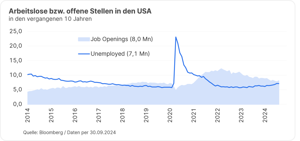 Am 18. September war es dann aber soweit und Jerome Powell überraschte die Märkte mit einer Reduktion des Leitzinssatzes in der Höhe von 50 Basispunkten. In der Regel werden die Zinsen um einen viertel Prozentpunkt (also 25 Basispunkte) angepasst, weshalb der Schritt doch überraschend für die Marktteilnehmer kam. Der über die Sommermonate leicht schwächelnde Arbeitsmarkt hat die Notenbanker zu diesem Schritt bewogen. Wie Sie der unten angeführten Darstellung entnehmen können, stieg zuletzt die Anzahl arbeitsloser Amerikaner:innen merklich und gleichzeitig reduzierten sich die offenen Stellen. Damit einhergehend stieg die Arbeitslosenrate von 3,4% im Jänner 2023 auf zuletzt 4,2% im August 2024.