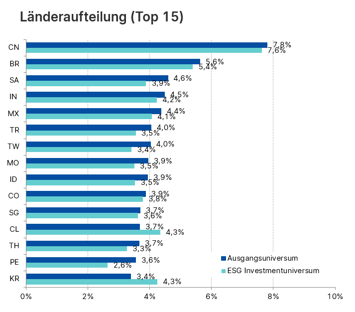 Um diesen bewussten Schritt Richtung Nachhaltigkeit gehen zu können, haben wir das investierbare Universum durchleuchtet und die erfreuliche Erkenntnis war, dass lediglich 25% der Emittenten die Investitionsschwelle nicht mehr erreichen. Entweder aus Gründen der Nachhaltigkeit oder aufgrund noch fehlender Daten, die aber für eine qualitativ hochwertige Analyse unerlässlich sind. Das zeigt auch, dass Emerging Markets und Nachhaltigkeit keine Bereiche ohne Schnittstellen sind, ohne dass ich hier Fakten über die teilweise fast exponentiell wachsenden Kapazitäten für Solarstrom oder Windstrom in den Schwellenländern erwähne.