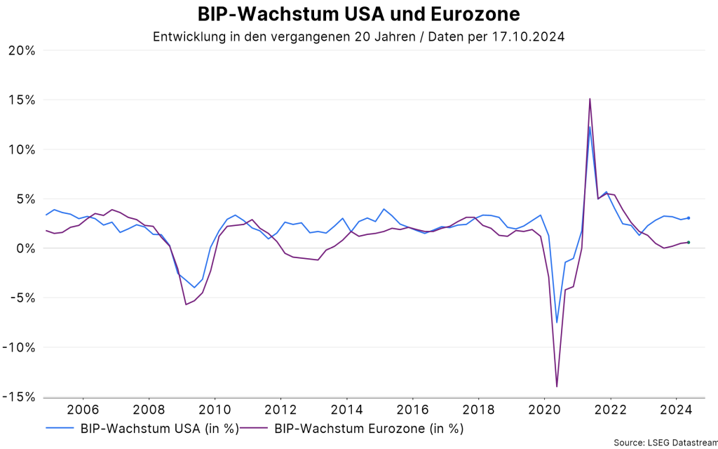 Die Eurozone ist nach fünf Quartalen Stagnation in den ersten drei Quartalen 2024 zu einem leichten Wachstum zurückgekehrt (rund 1% Quartalswachstum, annualisiert, Quelle: Eurostat, EAM). Allerdings ist das Wachstum noch nicht selbst tragend. Einige umfragebasierte Indikatoren sind schwach (Einkaufsmanagerindizes), das ausstehende Kreditvolumen stagniert und die Fertigung schrumpft (vor allem in Deutschland).