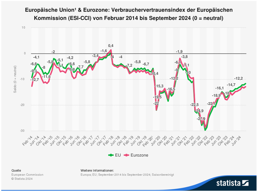Der starke Anstieg der Inflation hat die Kaufkraft und die Stimmung reduziert. Die Konsumentenpreisinflation ist mittlerweile deutlich gesunken. Die Gesamtzahl ohne Nahrungsmittel und Energie (Kernrate) ist nach der vorläufigen Schätzung im Monat September auf 2,7% im Jahresabstand gefallen (Quelle: Eurostat). Allerdings befindet sich die Konsumentenpreisinflation mit 4% im Jahresabstand nach wie vor auf einem hohen Niveau. Zudem droht ein permanenter Anstieg der langfristigen Inflationserwartungen, wenn die Abfolge von inflationären Schocks (Güterpreise, Energiepreise, Dienstleistungspreise) eine Fortsetzung findet. Auf der „Kandidatenliste“ steht unter anderem der Ölpreis (Hinweise: Naher Osten, Handelskrieg).