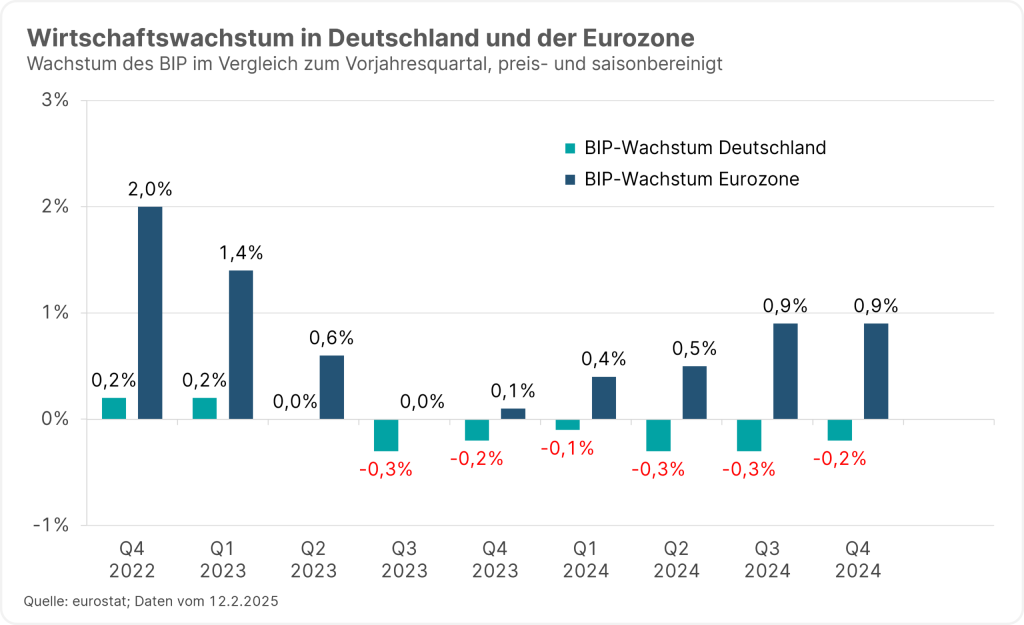 Im vergangenen Jahr ist Deutschlands Wirtschaft das zweite Jahr in Folge geschrumpft und stagniert vorerst weiter. Allein im vierten Quartal des abgelaufenen Jahres ist das BIP der größten Volkswirtschaft Europas stärker als erwartet um 0,2 Prozent im Vergleich zum Vorquartal geschrumpft. Für 2025 erwartet die deutsche Regierung ebenfalls nur ein Mini-Plus von 0,3 Prozent, wie das „Handelsblatt“ unter Berufung auf Regierungskreise berichtete.