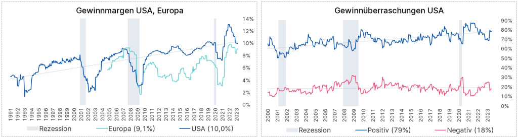 Ein Grund für die derzeitige Stabilität von Aktien ist in den Gewinnspannen und der Gewinnsituation insgesamt zu finden. In den USA haben sich die Gewinnmargen von ihrem Höchstwert (13,1%) am Ende der COVID-Pandemie zwar deutlich entfernt, trotzdem befinden sie sich mit 10,0% im langjährigen Aufwärtstrend und bleiben hoch. Hohe Unternehmensgewinne dämpfen die Volatilität. Auch die Werte für Europa zeigen keinerlei Einbruch.