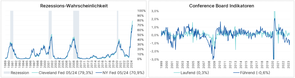 Das bedeutendste Risiko für die Aktienmärkte liegt in einer spürbaren Rezession in den USA. Rezessionen wurden in der Vergangenheit zwar prognostiziert, ihr Eintrittszeitpunkt und ihr Ausmaß war und ist im Vorfeld aus den volkswirtschaftlichen Daten nicht ablesbar. Zwei Teilorganisationen der US-Notenbank, die Cleveland Fed und die NY Fed, berechnen Wahrscheinlichkeitsmodelle aus der Struktur der US-Zinskurve. Deren Umkehrung war regelmäßig Vorbote einer Rezession: man erhält in dieser Situation für eine kurze Veranlagung mehr Zinsen als für eine langfristige, was eine ausgeprägte Unsicherheit dokumentiert (sogenannte inverse Zinskurve).