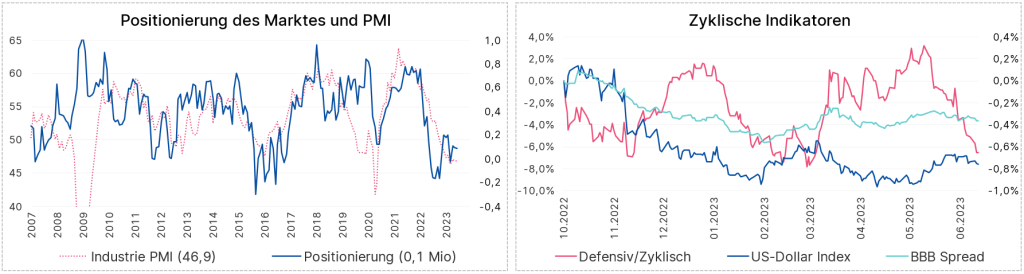 Ein verbleibender Grund für die niedrige Volatilität von Aktien ist die Positionierung des Marktes, gemessen an der Zahl spekulativer Futures-Positionen. Diese Zahl ist weiterhin niedrig. Ihr Verlauf ist vergleichbar mit dem unter Druck stehenden Industrie PMI Index. Nun ist es für einen skeptischen Markt leichter, unerfreuliche Nachrichten zu verarbeiten, weil vieles bereits eingepreist ist. Zusätzlich ist das Ausmaß, in dem der Markt jetzt noch weiter „short“ werden könnte, in gewisser Weise limitiert.