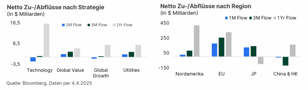 Die Tendenz, hin zur Risikoreduktion und teilweisen geographischen Neuausrichtung in der Asset-Allokation, wurde in den letzten Wochen auch von den großen Kapitalflüssen – gemessen an Zu- und Abflüssen großer ETFs – bestätigt. Das bietet eine unterstützende Dynamik für einen möglichen nachhaltigen Aufwärtstrend in diesem Segment. Wie aus den folgenden Balkendiagrammen hervorgeht, konnten nordamerikanische (>90% USA) Fonds weniger Zuflüsse, als europäische oder japanische verzeichnen. Darüber hinaus ist in den vergangenen Monaten vermehrt Kapital in defensive bzw. konservativ bewertete Aktiensegmente (Global Value) geflossen.