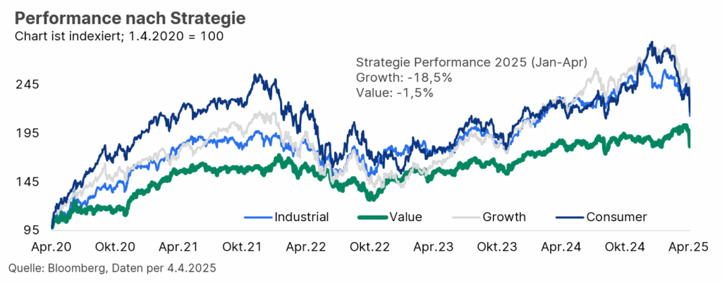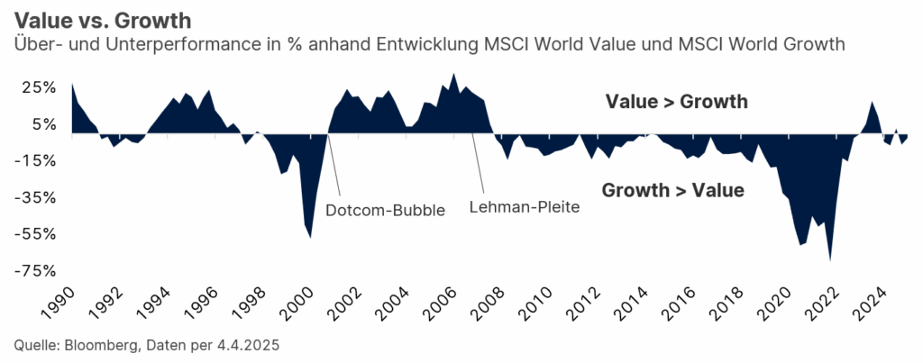 Eine auf Value-Aktien fokussierte Investment-Strategie selektiert Unternehmen nach relativer Bewertung zum Markt bzw. zum fairen, inneren Wert, laut Bilanzanalyse. Zudem spielen Qualitätsfaktoren wie: Resilienz des Geschäftsmodells und der Umsätze, solide Cash-Flow-Generierung bei gleichzeitig niedriger Verschuldungsquote und Stabilität der Nachfrage bzw. Preissetzungsmacht eine essenzielle Rolle. Vor allem Letzteres ist in Anbetracht der neuen Zölle ein wertvolles Differenzierungsmerkmal, da die Möglichkeit, höhere Preise an Konsument:innen in verschiedenen Ländern weiterzugeben, die Gewinnmargen nur marginal schmälert und somit die Profitabilität relativ stabil bleibt. Historisch betrachtet gelingt es Value-Unternehmen also besser, Stressphasen an den globalen Finanzmärkten zu umschiffen, was mit einer höheren Investorennachfrage einhergeht und tendenziell zu einer relativ starken Performance führen kann. (Hinweis: Die Wertentwicklung in der Vergangenheit ist kein zuverlässiger Indikator für künftige Wertentwicklungen).