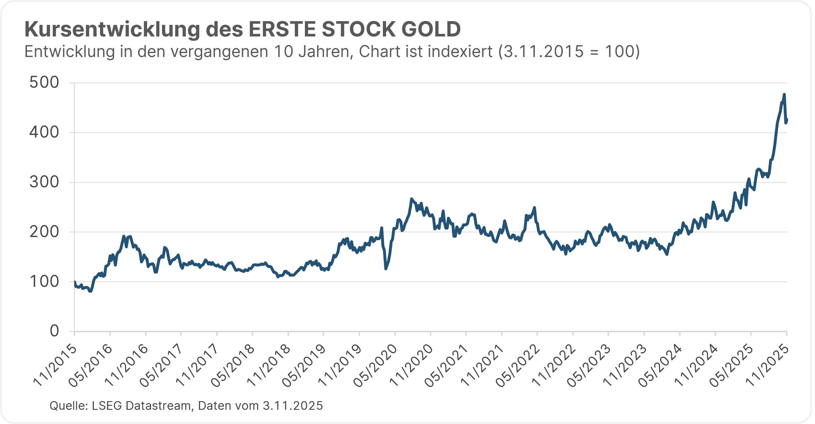 Andreas Böger, Fondsmanager des ERSTE STOCK GOLD, wies in diesem Zusammenhang auf einen besonderen „Goldnugget-Effekt“ für die Aktionär:innen dieser Unternehmen hin: „Während der Goldpreis in den letzten zehn Jahren von ca. 1.100 US-Dollar auf zuletzt über 4.000 US-Dollar pro Unze gestiegen ist, haben sich die Produktionskosten nur moderat von ca. 1.000 auf 1.600 US-Dollar erhöht. Die operative Marge der Branche ist dadurch auf ein Rekordniveau gestiegen.“