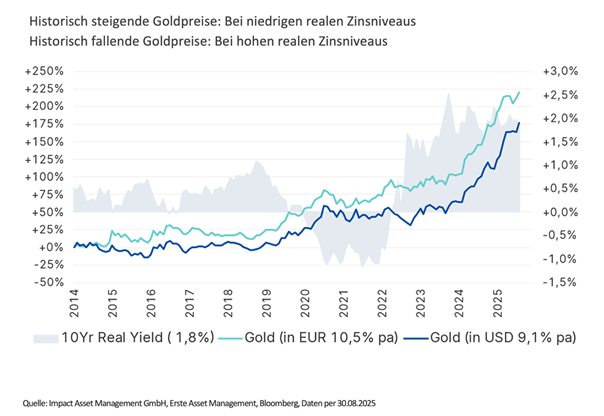 In einem Umfeld sinkender Zinsen und geopolitischer Unsicherheit war Gold als alternative Anlageform schon immer besonders gefragt. Doch die aktuelle Entwicklung habe einige Besonderheiten aufzuweisen, betonte Daniel Feix. So sei der Goldpreis in der Vergangenheit regelmäßig gestiegen, wenn das reale Zinsniveau niedrig war. Bei hohen Zinsen sei er dann aber wieder gefallen. „Seit 2022 gilt diese Formel nicht mehr“, analysierte Feix. „Trotz steigender Zinsen ging der Goldpreis weiter nach oben.“ Zuletzt ist er förmlich explodiert, allein seit Jahresbeginn um rund 50 Prozent.