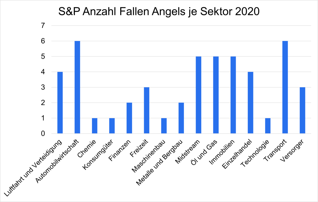 Das größte Unternehmen, das 2020 zum Fallen Angel wurde, ist Ford. Im März 2020 stufte S&P die Kreditwürdigkeit von Ford aufgrund von schlechteren Unternehmenszahlen von Investment Grade auf den Junk-Status herab. Immerhin $78 Mrd. an ausstehenden Anleihen waren davon betroffen.