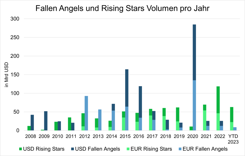 Seit 2020 hat sich allerdings einiges getan. Die Pandemie ist überwunden und durch viele fiskalische Hilfspakete und eine schnelle Erholung vor allem 2021 und 2022 konnten sich viele Unternehmen entschulden. Nach der starken Welle an Fallen Angels im Jahr 2020 waren die letzten drei Jahre hauptsächlich von Rising Stars geprägt.