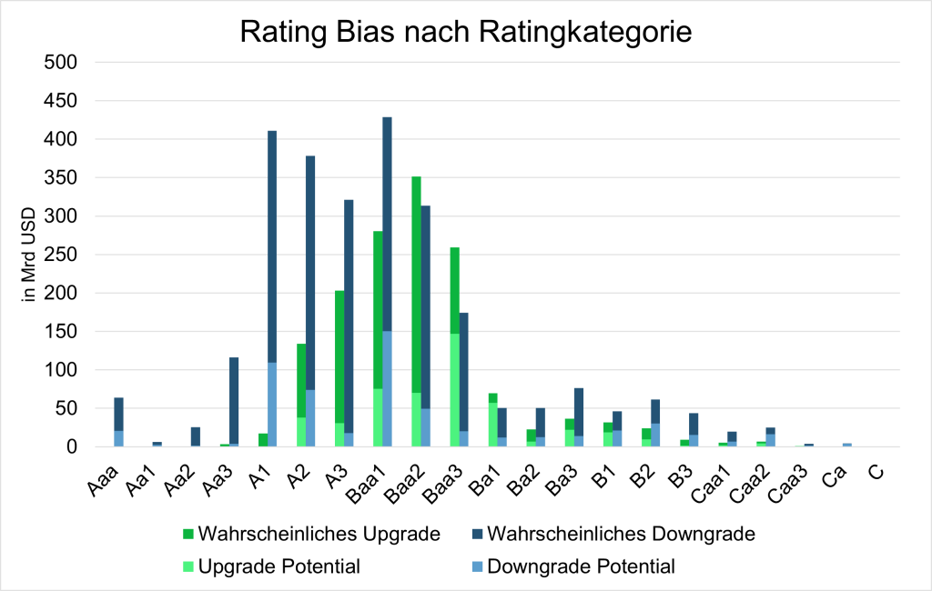 Betrachtet man die Ratingerwartungen von Bloomberg über die verschiedenen Ratingklassen, so sieht man, dass vor allem im Segment Baa2 bis Ba1, also genau dem Übergang zwischen Investment Grade und High Yield mehr Anleihen weiterhin potenzielle Upgrade-Kandidaten sind. Allerdings sieht man bereits eine Verlangsamung des Trends und bei den sehr gut gerateten Unternehmen (Baa1und höher) und unteren Ratingkategorien (Ba2 und darunter) steigt die Wahrscheinlichkeit an, dass es zu mehr Herabstufungen als Heraufstufungen kommt.